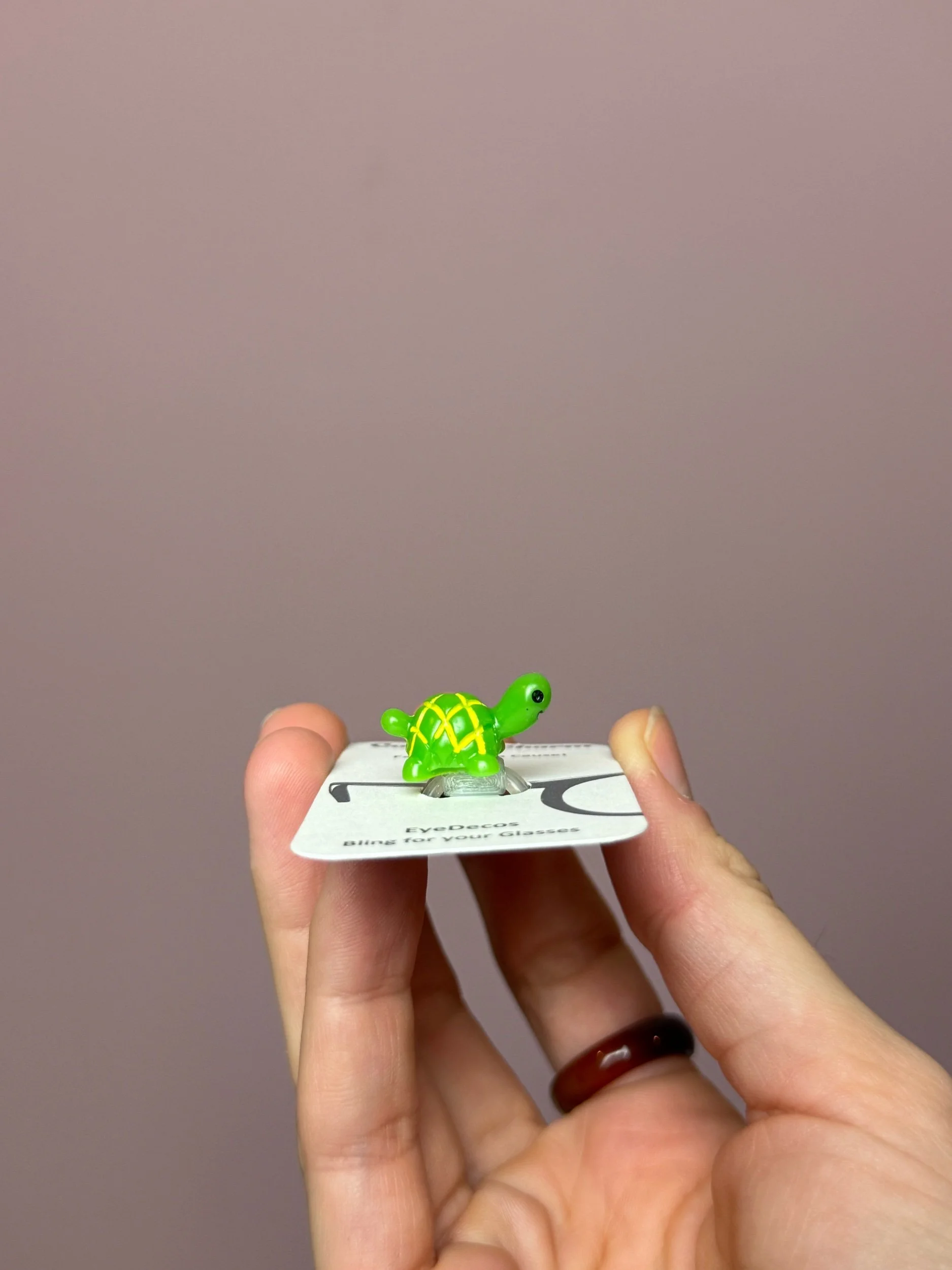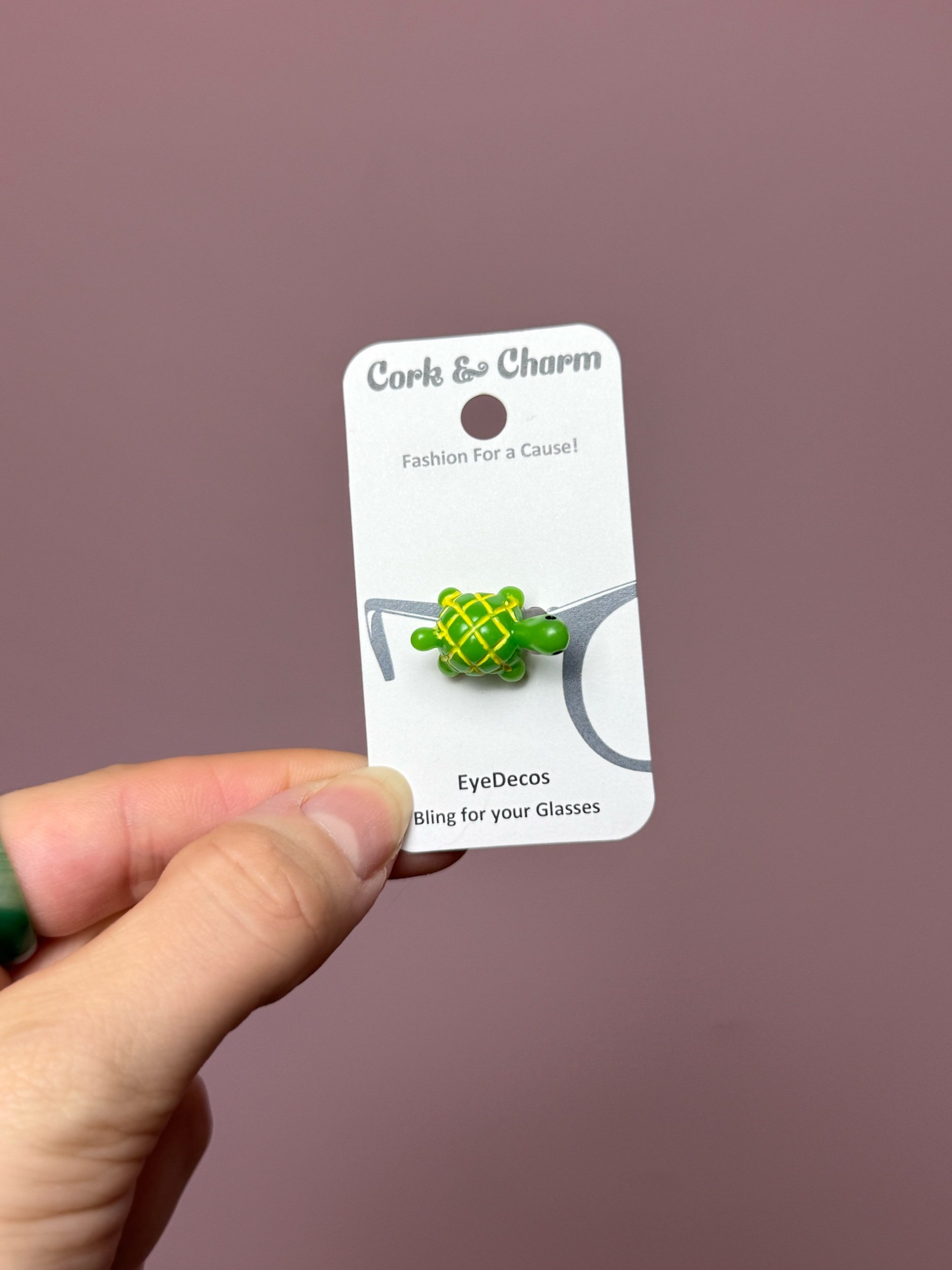 Cartoon Green Turtle Eye Deco, strong plastic material, clear bands that wrap around your glasses keeps the turtle in place. Made & donated by Cork & Charm, a woman owned small business.