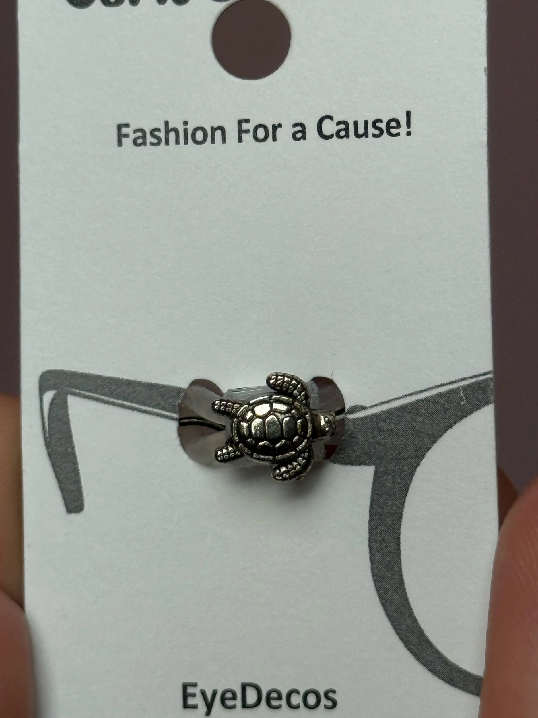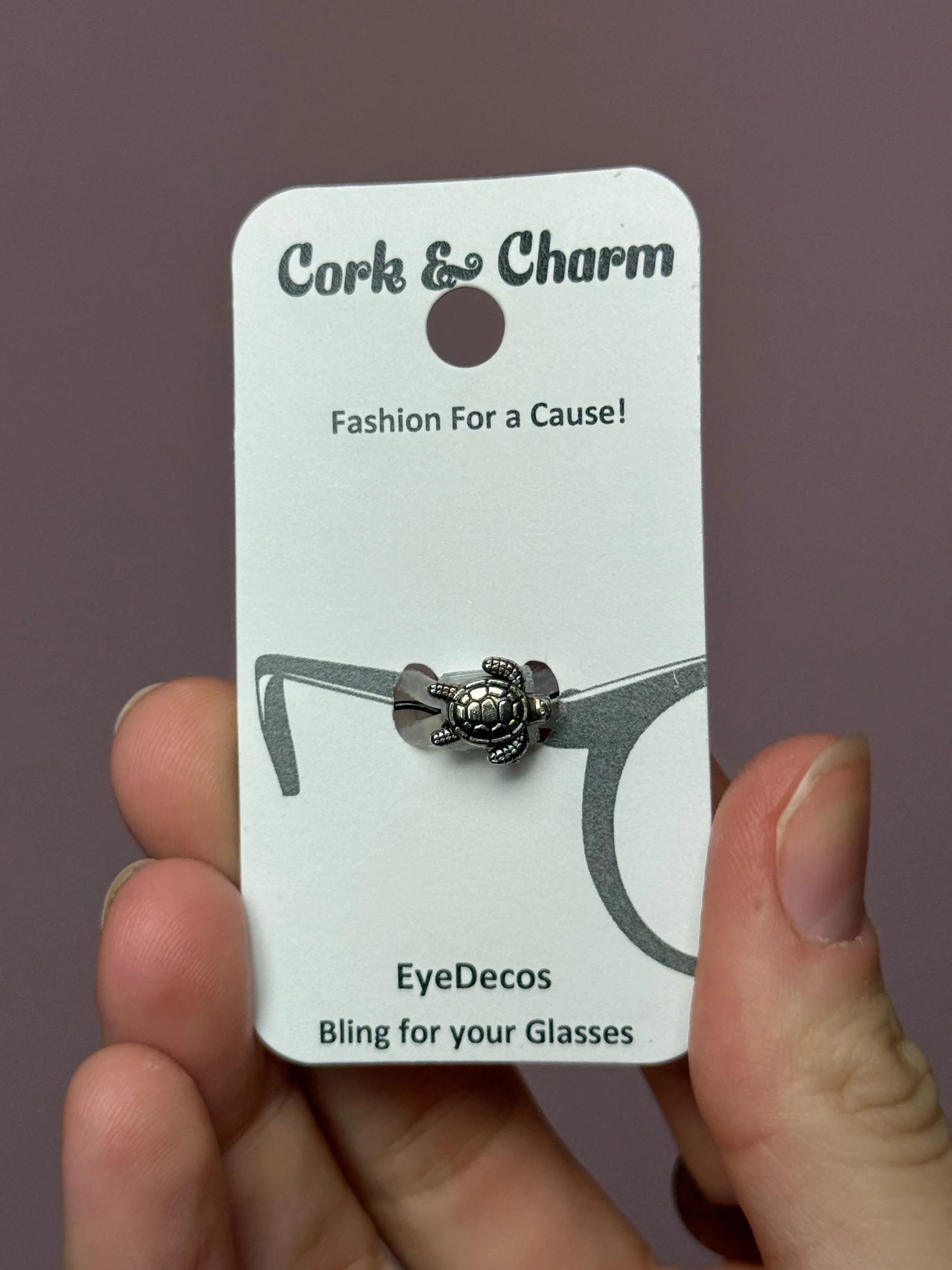 Mini metallic turtle eye deco, secured to your glasses by a clear band, Made & donated by Cork & Charm, a woman owned small business.