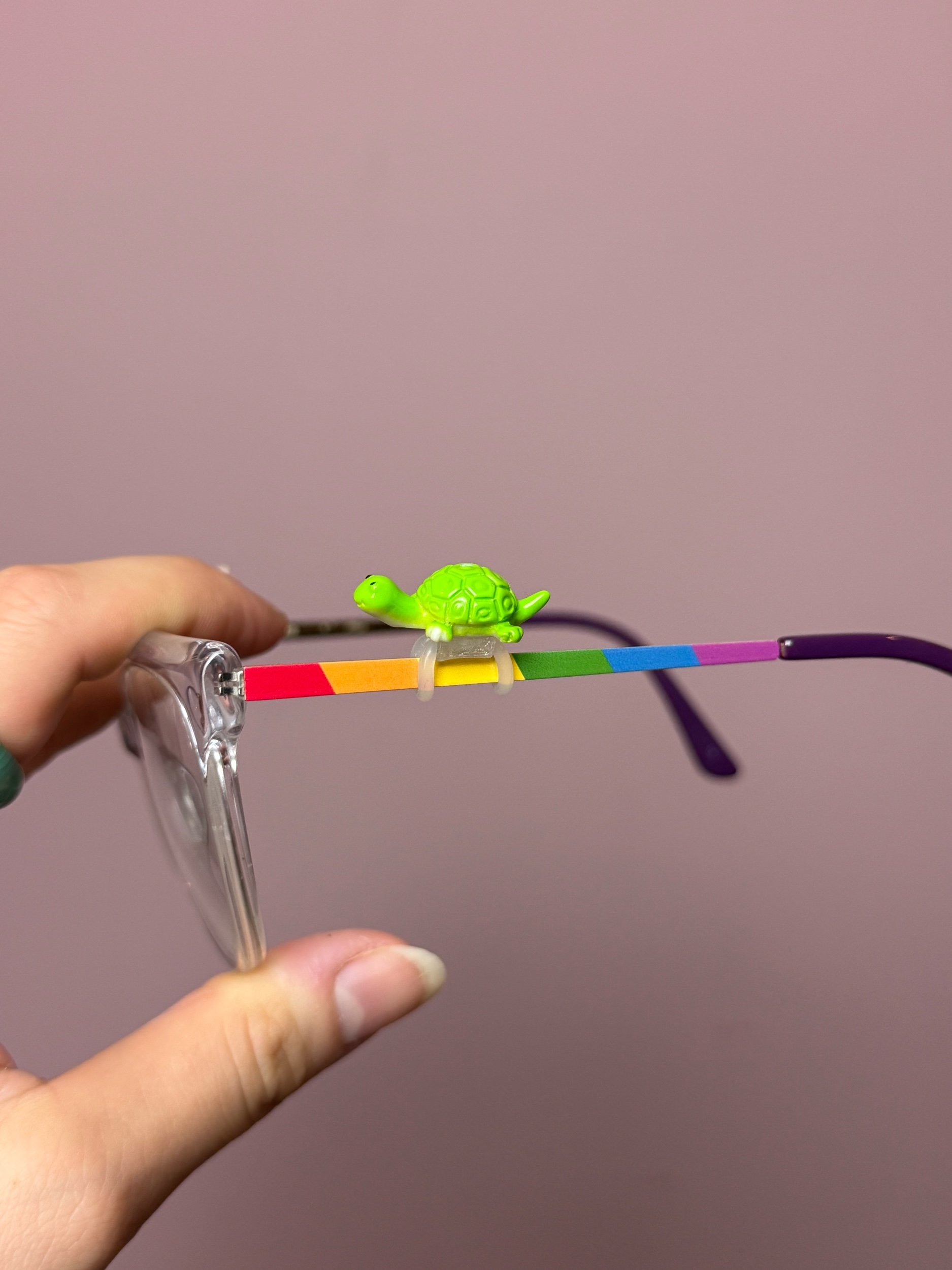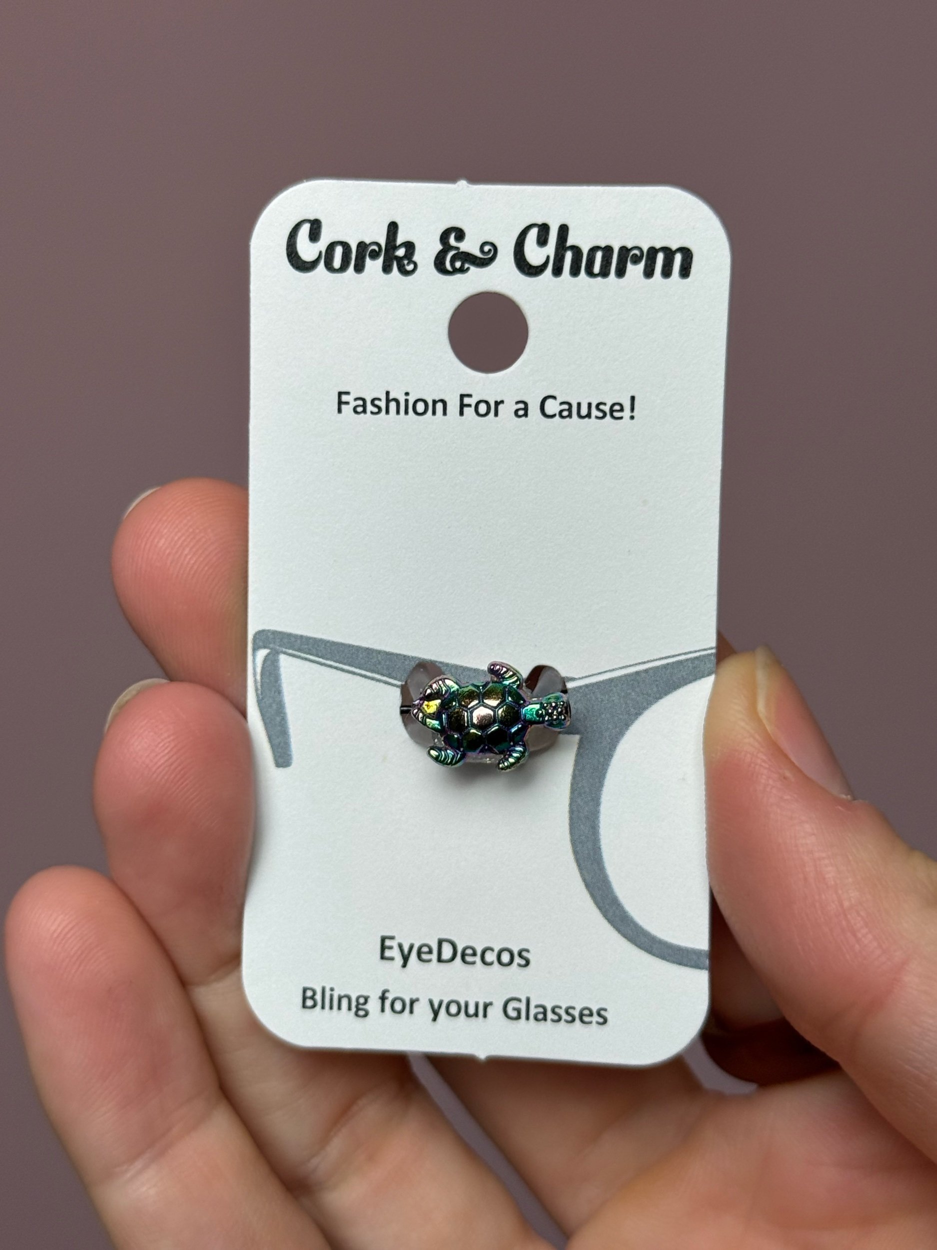 Iridescent Metallic Turtle Eye Deco, held onto your glasses by a clear band to secure the turtle. Made & donated by Cork & Charm, a woman owned small business.