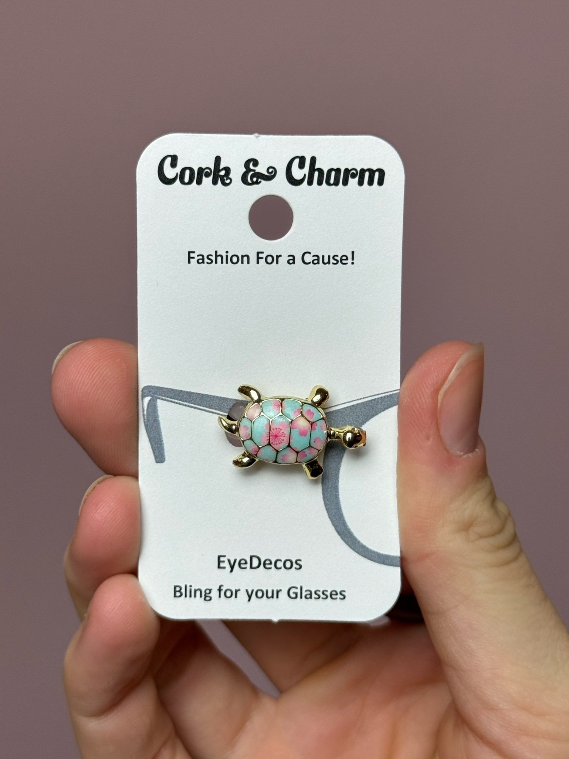 Pink & Blue Floral Metallic Turtle Eye Deco. Metallic body with a pink and blue shell, secured to your glasses by a clear band that holds the turtle in place. Made & donated by Cork & Charm, a woman owned small business.